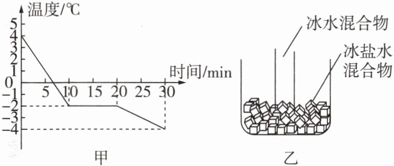 4 小明发现严冬季节水缸里的水结冰了,但腌菜缸里的盐水却没有,小明猜想,水中加入别的物质后,会对水的凝固点产生影响。为了验证这一猜想,他将一些盐放入水中,并把盐水用容器盛好放入冰箱,研究盐水的凝固过程。每隔一定时间,小明就观察盐水状态,测出温度,并将凝固过程记录的数据画成了温度—时间图像,如图甲所示。