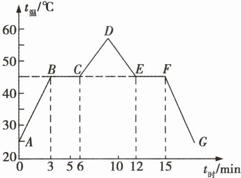 A 熔化时吸热但温度不变,所以该物质是晶体,从第3min开始熔化,到第6min结束,故在t时=5min时,该物质处于固液共存状态,故A正确。在BC段,该物质不断吸热,但温度不变,故B错误。该物质从第12min开始凝固,到第15min凝固结束,凝固过程持续了3min,故C错误。该物质在EF段凝固,此过程放热,但温度不变,故D错误。