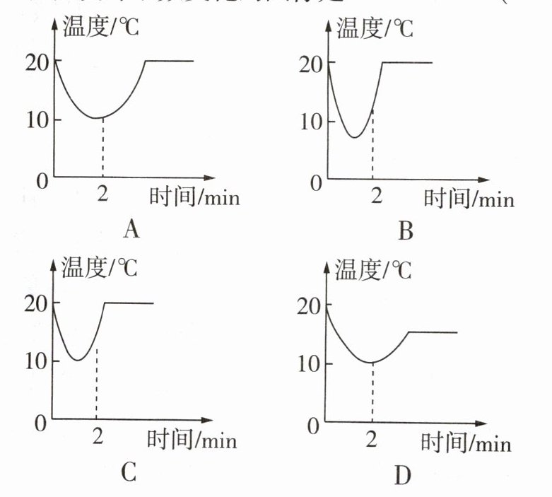 5 [科学推理][2024 苏州外国语学校期中]将浸有少量酒精的棉花裹在温度计的玻璃泡上,温度计示数随时间的变化情况的大致图像如图所示。若在该实验的过程中,用风扇对酒精棉吹风,则下列最能合理反映此过程温度计示数变化的图像是( )