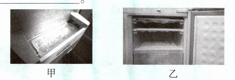 4小健打开冰箱冷藏室和冷冻室的门发现,有的地方产生了水珠(如图甲),有的地方产生了霜(如图乙)。水珠产生的原因是水蒸气遇冷______(填物态变化名称)成小水珠,霜产生的原因是水蒸气遇冷______(填物态变化名称)成霜。两过程都是水蒸气遇冷发生的物态变化,产生的现象却不同,原因是______。