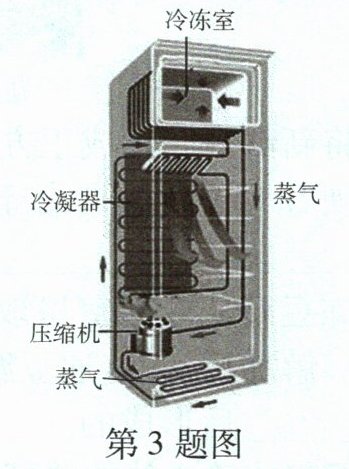 3如图是冰箱制冷剂循环路线示意图,液态制冷剂进入冰箱内冷冻室的管道,迅速______(填物态变化名称),此过程______(填"吸热"或"放热"),生成的蒸气又被电动压缩机抽走,压入冷凝器,在冷凝器管道内______(填物态变化名称),变成液态,并在此过程______(填"吸热"或"放热"),把冰箱内的热"搬"到了冰箱外面。冰箱中的"制冷剂"应具有沸点______(填"低"或"高")的性质。
