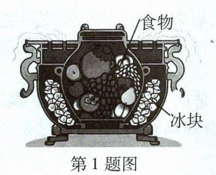 1人类用冰的历史十分久远。《周礼》里就有有关"冰鉴"的记载。所谓"冰鉴"就是暑天用来盛冰,并置食物于其中的容器,如图所示。算起来,"冰鉴"是人类最早使用的"冰箱"了。"冰鉴"利用冰块______(填物态变化名称)吸热的原理,来达到降低食物周围的温度的目的,从而起到食物保鲜的功能。