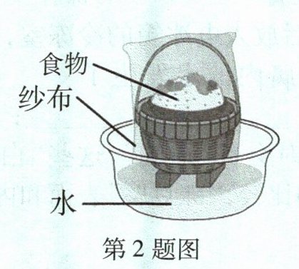 2在没有冰块时,也可以通过如图所示的简易冰箱来保存食物。纱布袋上的水发生______(填物态变化名称)时会吸收热量,使篮子里的食物温度降低。
