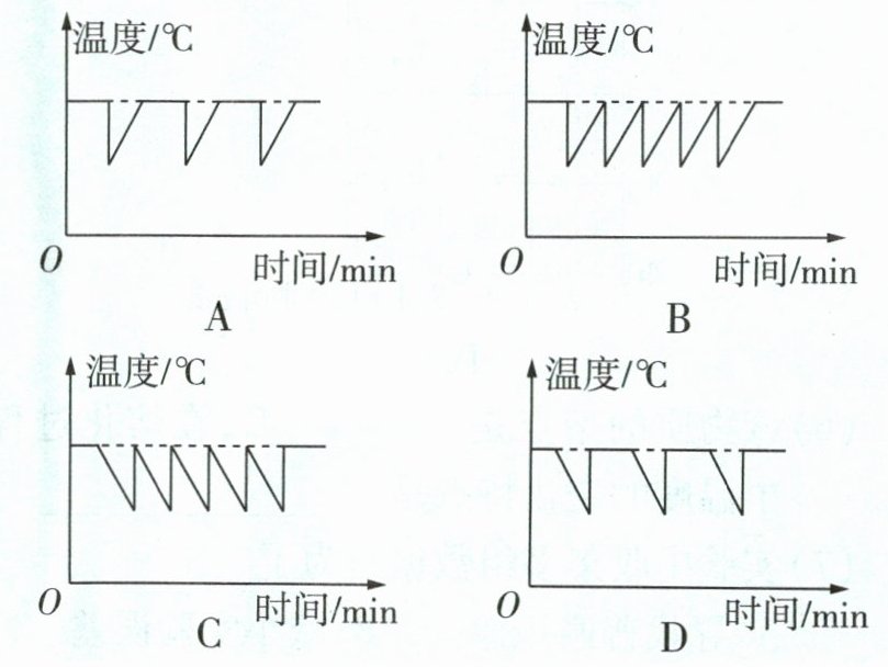 (11) 妈妈在煮饺子时,水沸腾后通常会往锅里加入半碗冷水,使其停止沸腾,当水再次沸腾一段时间后再加冷水,反复几次之后饺子就煮熟了。用纵轴表示水温,横轴表示加热时间,下列图像中能大致反映水温随时间变化的是______。(填字母)