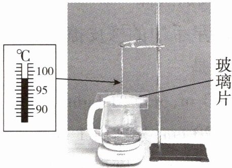 8 [2024 无锡中考]做“观察水的沸腾”实验时,电热水壶中装有适量的水,闭合开关加热。当水沸腾时,温度计的示数如图所示,为______℃。玻璃片下表面出现小水珠,这是______(填物态变化名称)现象。停止加热,水不能继续沸腾,这说明沸腾时需要______。