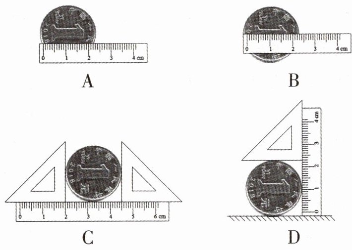 C A、B选项,直接用刻度尺来寻找硬币的直径的方法是不科学的,误差较大,错误;C选项为“辅助工具法”,两三角板的直角边所对应的示数之差即为硬币的直径大小,正确;D选项,硬币最下端未与刻度尺的零刻度线或整刻度线对齐,错误。