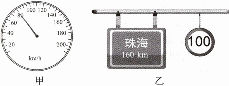 (2)由题图乙可知,该路段汽车最大行驶速度$v=100\ km/h$,由$v=\frac{s}{t}$可知,从标志牌到珠海最快需要的时间$t=\frac{s}{v}=\frac{160\ km}{100\ km/h}=1.6\ h$。