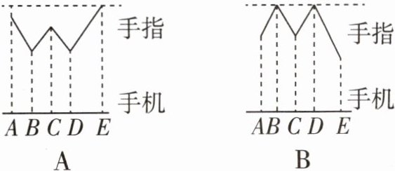 3 [2025 无锡侨谊实验学校月考]某公司成功研发出超声波指纹识别系统,其工作原理与声呐类似。如图是手机超声波指纹识别系统,手机发出的超声波遇到手指上凹凸不平的指纹A、B、C、D、E五个位置,测得回收信号的时间分别为0.29 ms、0.41 ms、0.29 ms、0.41 ms、0.32 ms,根据时间,求出手指到手机平面的距离,可绘出指纹的大致形状,则该处指纹的大致形状是( )