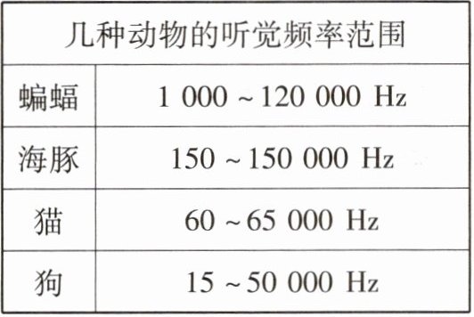 D 因为地震产生的次声波频率低于20 Hz,由表格可知,狗听觉频率是15~50 000 Hz,有一部分次声波频率在此范围之内,所以狗能感觉到地震,会有较为明显的反应。