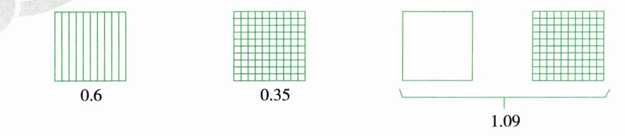 第三个图形:$1.09 - 1 = 0.09$,将右边图形平均分成100份,涂9份,左边图形全部涂色。