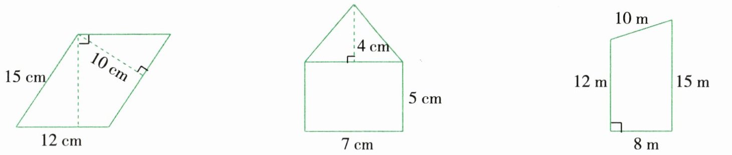 10×15=150(cm²) 5×7+7×4÷2=49(cm²) (12+15)×8÷2=108(m²)