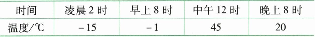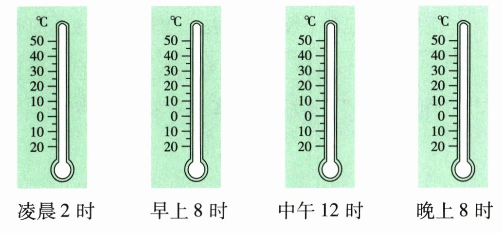 1. 沙漠里一天中的温差非常大,下表列出了四个不同时刻的温度。请你在相应的温度计上分别表示出这些温度,再把四个时刻的温度从高到低排列。(8分)