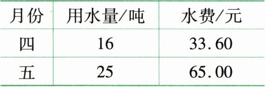 33.60÷16=2.1(元) 2.1×20=42(元) (65-42)÷(25-20)=4.6(元) 42+4.6×(30-20)=88(元) 答:这个地区水费的“调节价”为每吨4.6元,该户居民六月份的水费是88元。