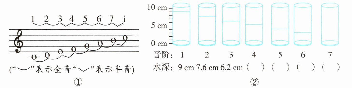 (1)从 到 水深减少9−7.6=1.4(cm),从 到 水深减少7.6−6 = .4(cm),则高一个全音水深减少1.4cm高一个半音水深减少0.7cm(0.7+0.7=1.4, .4的一半就是0 7)。从 到 升高一个半音第4个水杯中的水深为6 2−0 7=5 5(cm);从 到 升高一个全音第5个水杯中的水深为5 5-1 4=4 1(cm);从 到 升高一个全音第6 个水杯中的水深为4 −1 4=2 7(cm);从 到 升高一个全音第7个水杯中的水深为2 7−1 4=1 3(cm)。