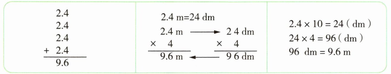 (1)制作一根跳绳需要 $2.4$ m 长的绳子,制作这样的 $4$ 根跳绳需要多长的绳子? 列式是 $2.4×4$。下面关于 $2.4×4$ 的计算,正确的有(