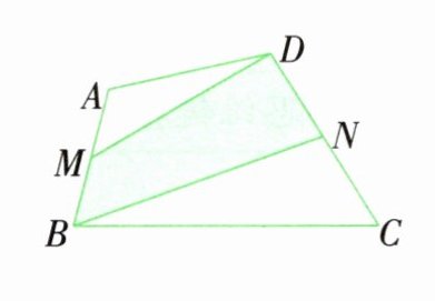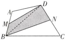 解析 如图,图中阴影部分BNDM是一个不规则的四边形,不能直接求出它的面积。连接BD,将四边形ABCD分成两个三角形。在三角形ABD和三角形BDC中,由于M、N分别是AB、CD的中点,根据等底等高三角形面积相等的道理,可知$S_{三角形AMD}=S_{三角形MBD}$,$S_{三角形DNB}=S_{三角形CNB}$。所以阴影部分的面积与空白部分的两个三角形的面积之和相等,都是四边形ABCD的面积的一半。