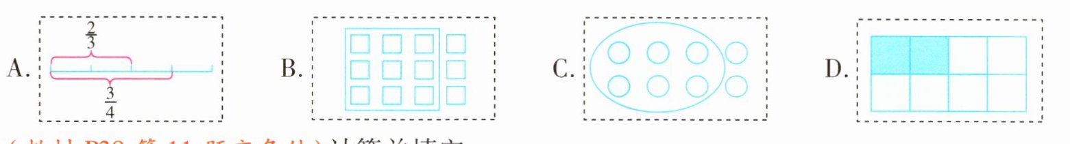 3 (名校期末真题)下图不能正确地表示$\frac { 3 } { 4 } × \frac { 2 } { 3 }$ 的是(
