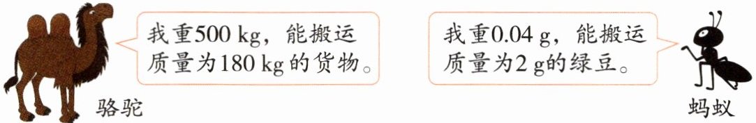 5 (名校期末真题)根据下面的对话分别写出骆驼与蚂蚁能搬运物体的质量与它们自身体重的比,并算出比值。相对于自身的体重,你觉得它们谁的相对力气大? 为什么?