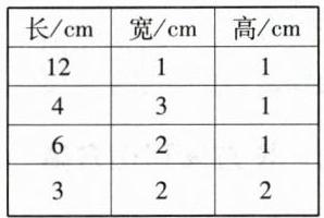 5 (探究题·思考过程)用12个棱长1cm的小正方体摆成一个长方体,它的长、宽、高各是多少?你有几种摆法? 请摆一摆,并填写下表。它们的体积相等吗? 为什么?