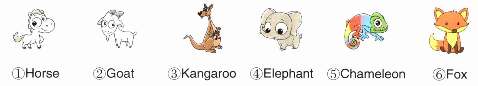 三、(新考法)动物排排站。下面的小动物要参加运动会,它们的出场顺序是按照英文名称的首字母在字母表中的顺序确定的,你来为它们排一排吧!