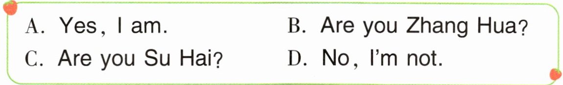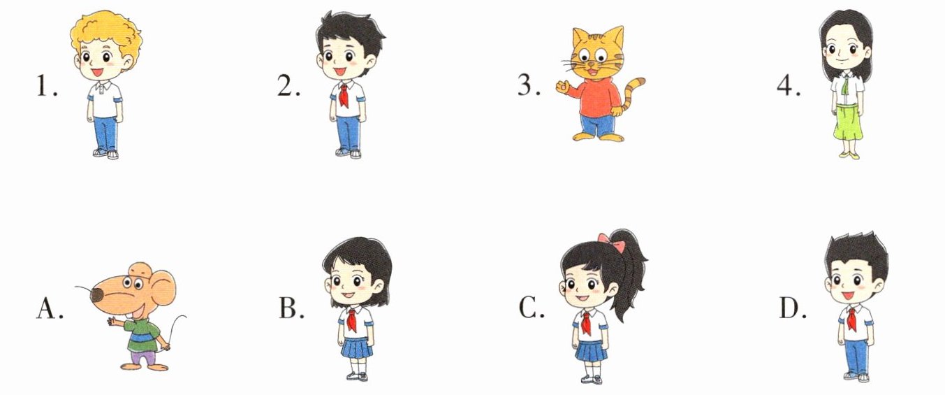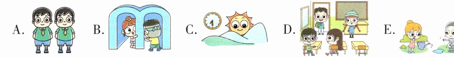 四、看图识人。根据提示,选择合适的句子补全对话(填序号)。