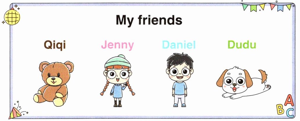 Hi, I'm Xiaoxing. 1. ______ is Jenny. She is my friend. She is a 2. ______. This is Daniel. 3. ______ is my friend too. Qiqi is a toy bear (玩具熊). Dudu is a dog (狗). They (他们) are my 4. ______.