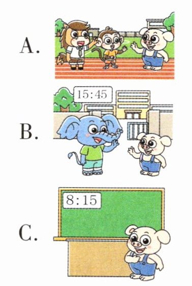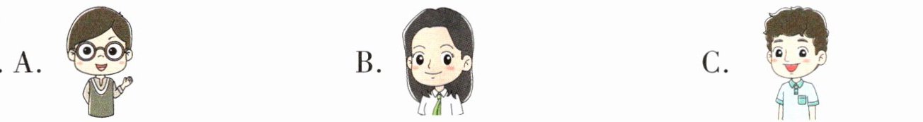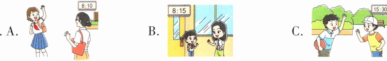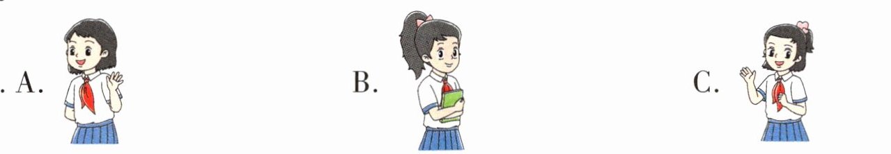 二、校园里,同学们见面都有礼貌地互相打招呼。听录音,选择与所听内容相符的图片。