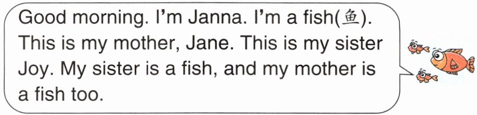 Good morning. I'm Janna. I'm a fish (鱼). This is my mother, Jane. This is my sister Joy. My sister is a fish, and my mother is a fish too.