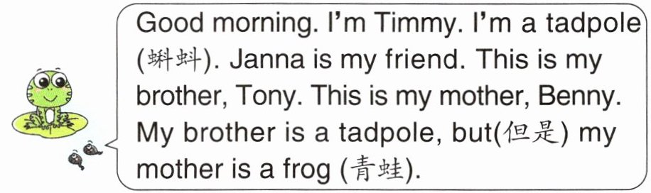 Good morning. I'm Timmy. I'm a tadpole (蝌蚪). Janna is my friend. This is my brother, Tony. This is my mother, Benny. My brother is a tadpole, but (但是) my mother is a frog (青蛙).