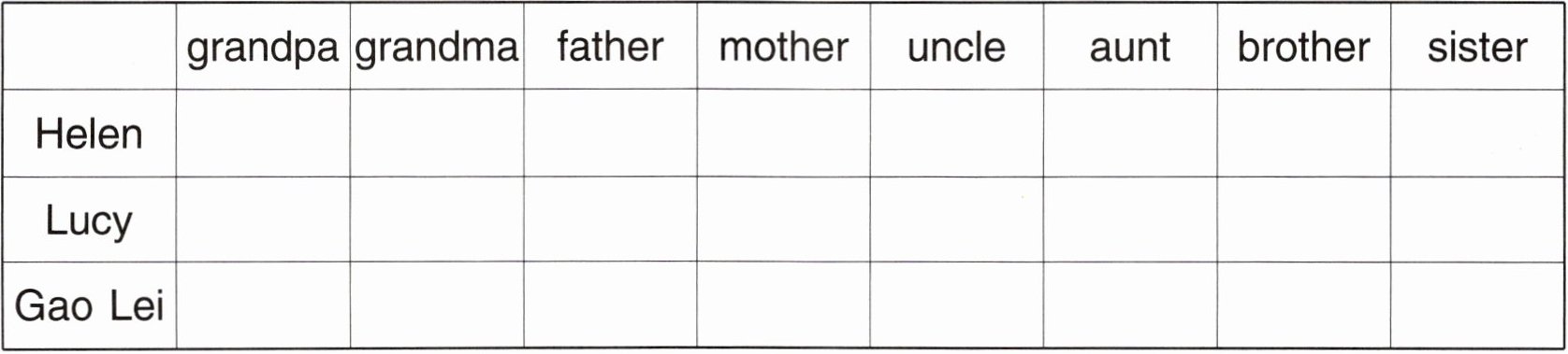 任务一:grandpa grandma father mother uncle aunt brother sister Helen √ √ Lucy √ √ √ √ √ Gao Lei √ √ √ √ √ 任务二:1.× 2.√ 3.√