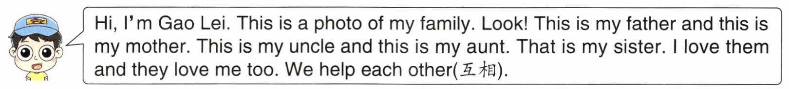 Hi, I'm Gao Lei. This is a photo of my family. Look! This is my father and this is my mother. This is my uncle and this is my aunt. That is my sister. I love them and they love me too. We help each other (互相).