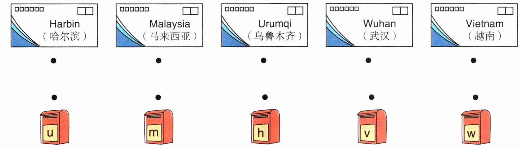 三、Liu Jiajia 体验的是邮递员。请根据地点的首字母将信件投递到相应的信箱中。