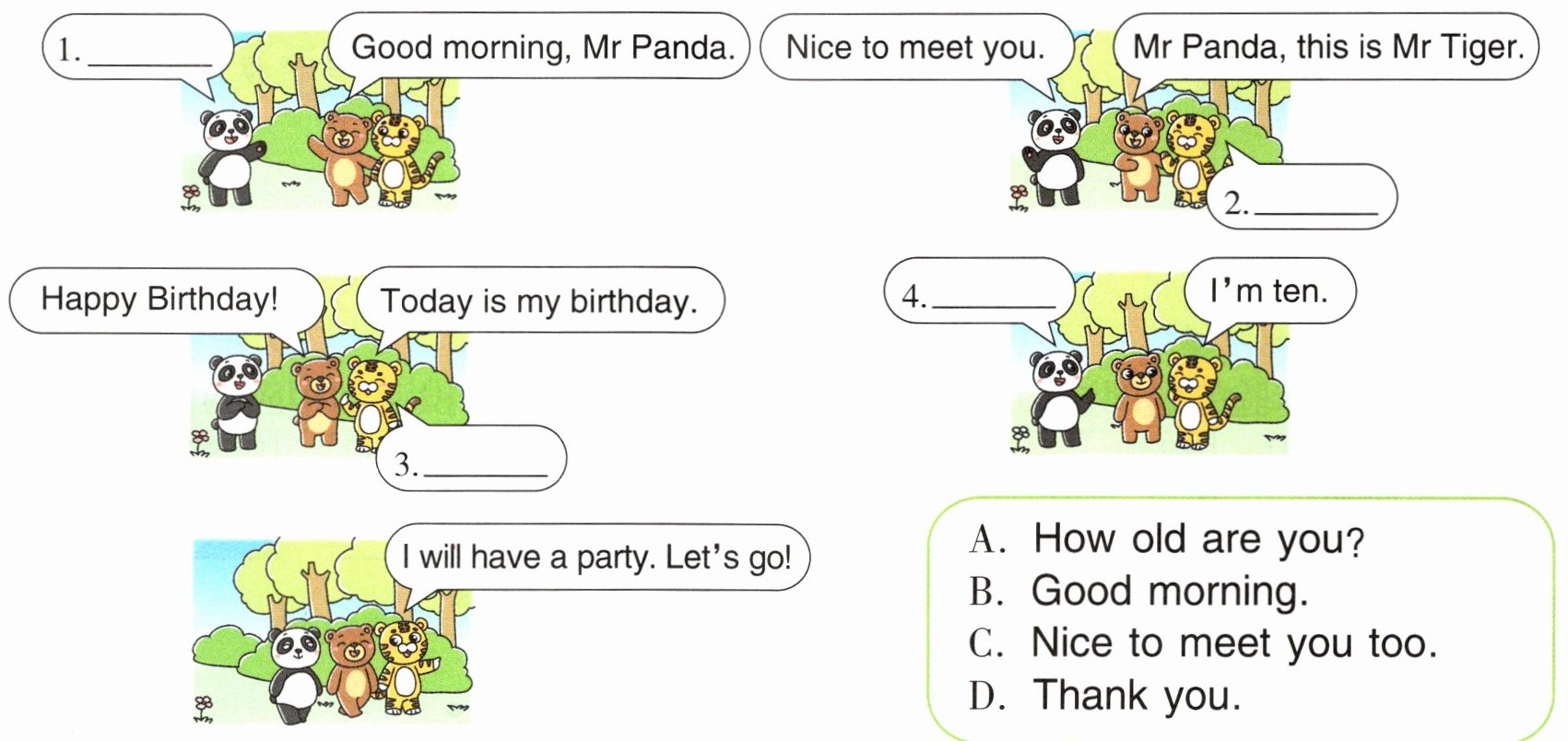 1.______ Good morning, Mr Panda. Nice to meet you. Mr Panda, this is Mr Tiger. 2.______