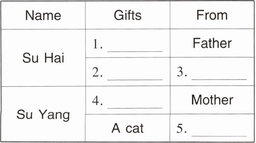 My name is Su Hai. I have a twin sister, Su Yang. Today is our birthday. We are both ten. This is our big birthday cake. Here are our gifts. My father gives me a big ball. My mother gives Su Yang three books. My grandma gives me a car and my grandpa gives Su Yang a cat. We love our family.