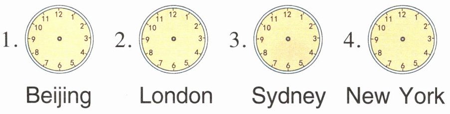 任务二:根据微信聊天记录,在钟面上画出同一时刻不同城市的时间。
