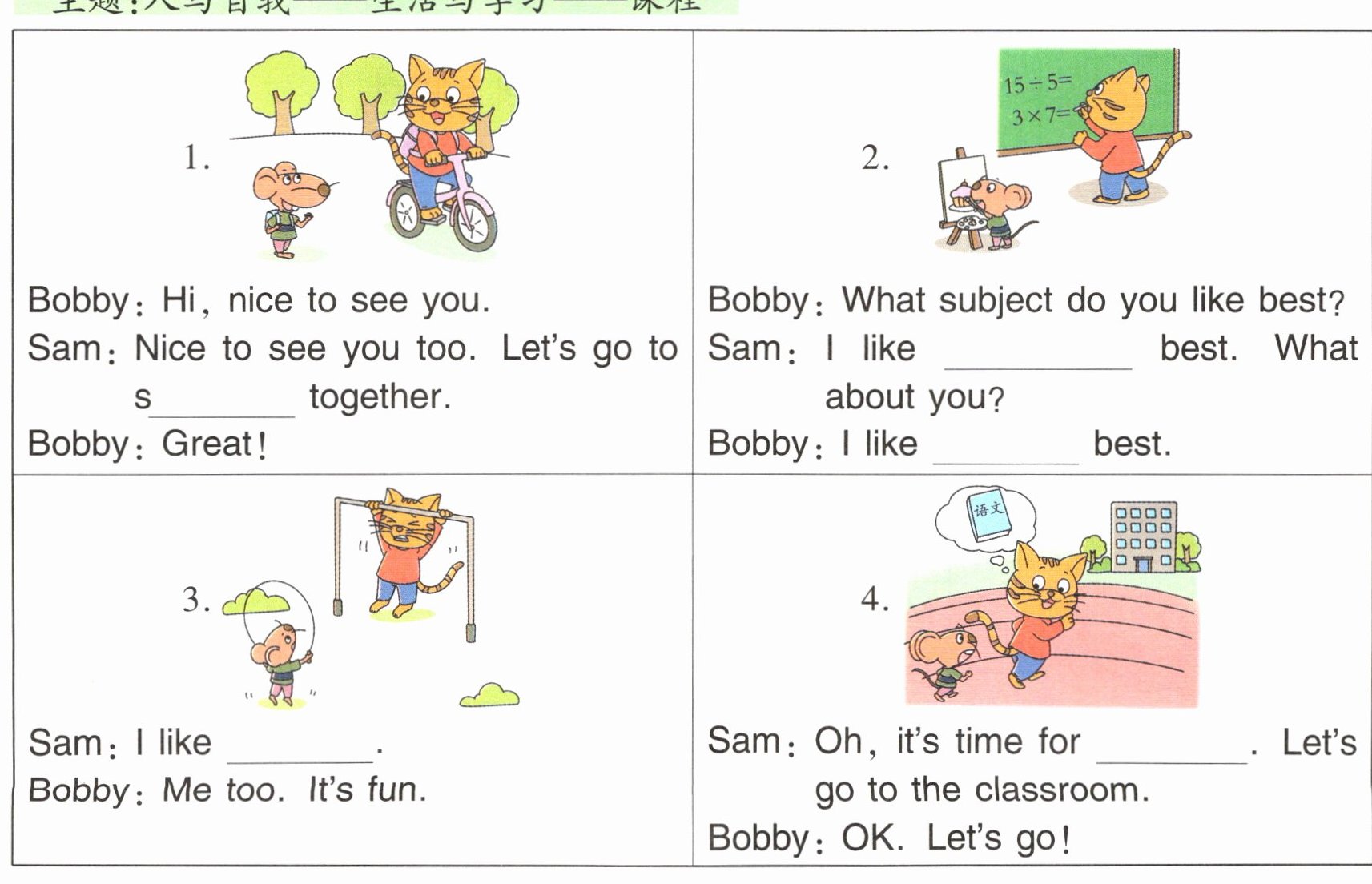 | 1. Bobby: Hi, nice to see you. Sam: Nice to see you too. Let's go to s______ together. Bobby: Great! | 2. Bobby: What subject do you like best? Sam: I like ______ best. What about you? Bobby: I like ______ best. |