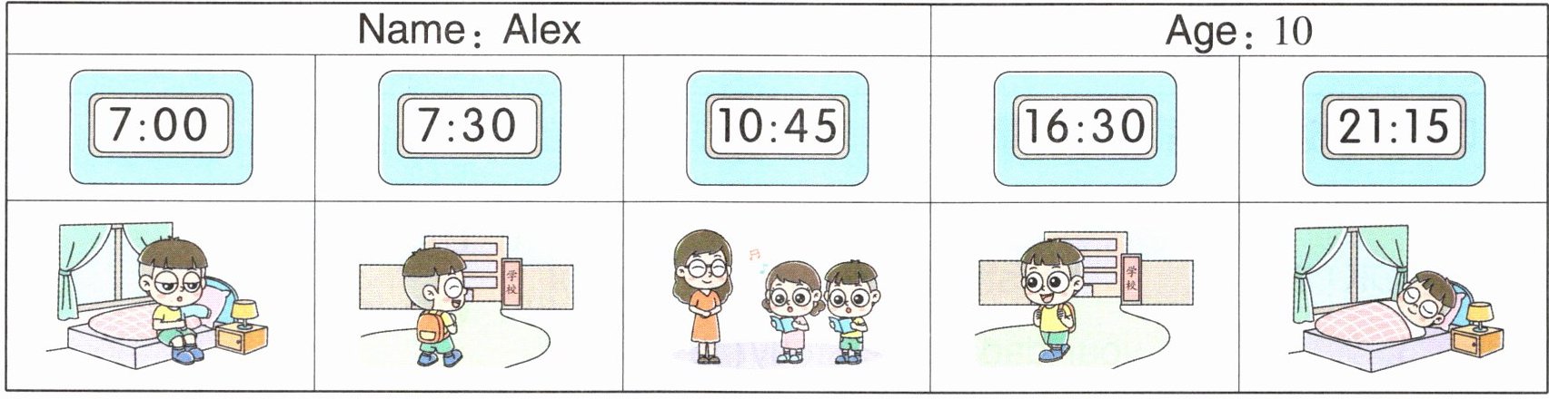 一、(新考法)Alex 制作了自己一天的活动安排卡。根据卡片内容,判断句子正(T)误(F)。
