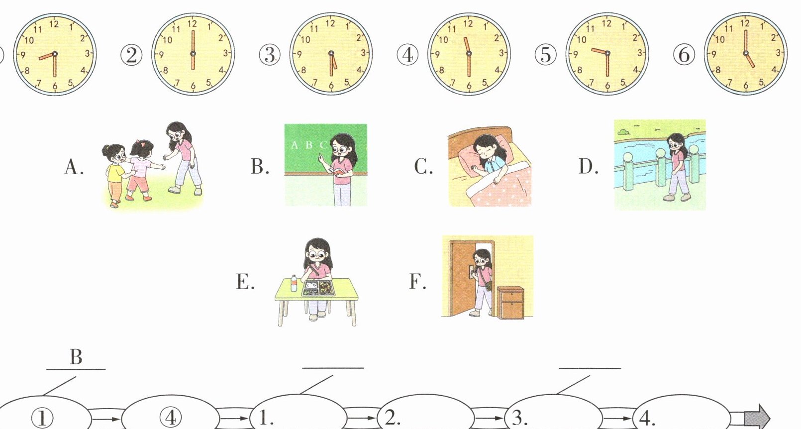 六、(新题型)通过在课堂上的讨论,大家一致认为合理规划时间尤为重要。老师是怎样度过每一天的呢?请阅读短文,选择合适的图片完成时间轴。