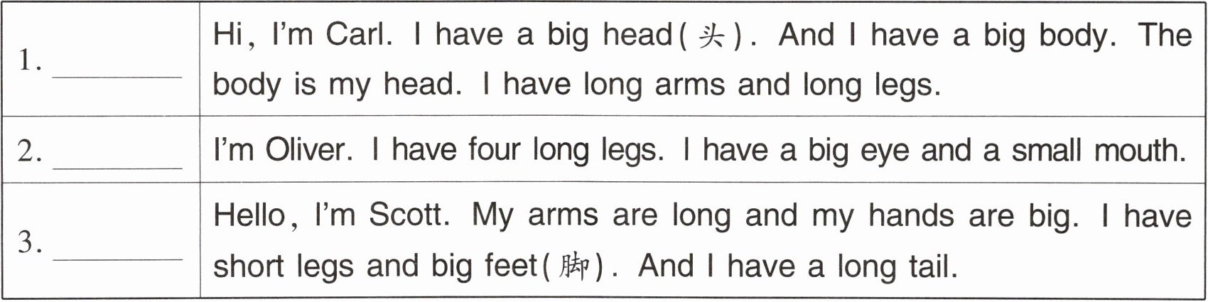 | 3. ______ | Hello, I'm Scott. My arms are long and my hands are big. I have short legs and big feet(脚). And I have a long tail. |