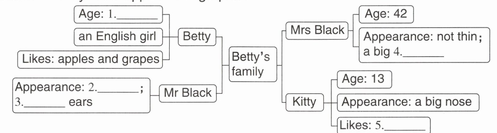 Betty is my friend. She is ten. She is an English girl. Her father, Mr Black, is tall. His ears are small. Betty's mother is not thin. She has a big mouth. She is forty-two. Betty's sister is Kitty. She is thirteen. She has a big nose. She likes bananas. Betty likes apples and grapes.