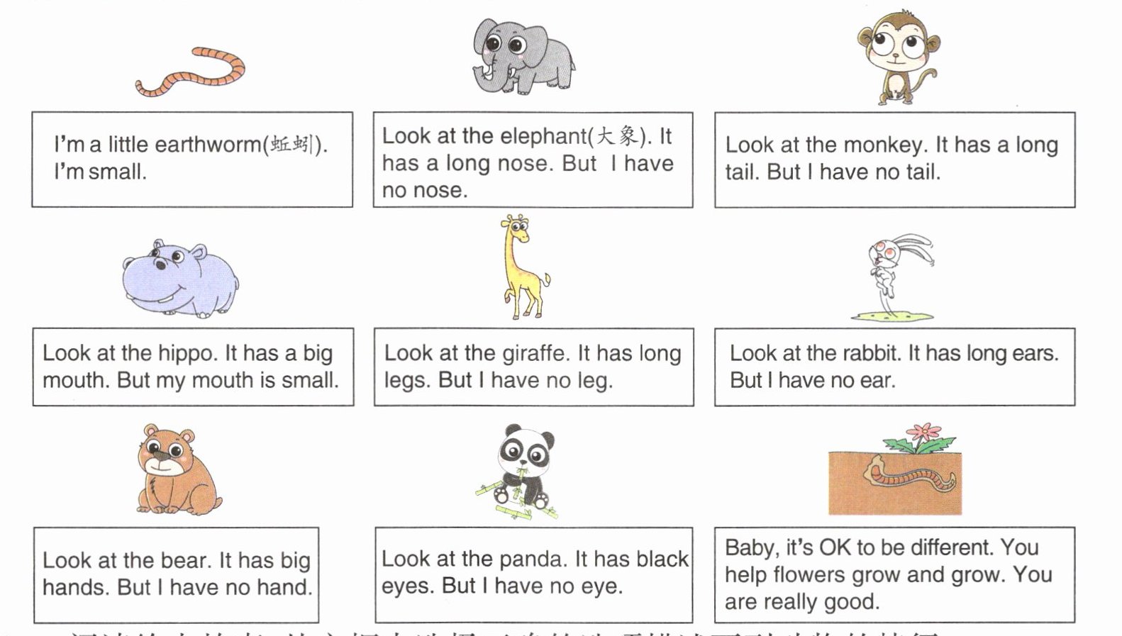 Look at the elephant (大象). It has a long nose. But I have no nose.