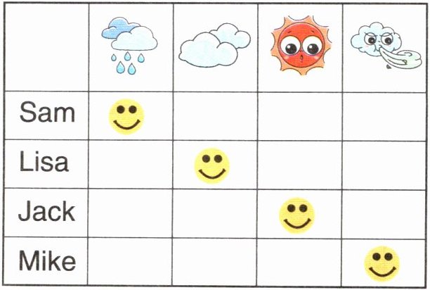 四、Su Hai 调查同学们各自喜欢的天气,并制作了表格。根据表格内容,补全句子。