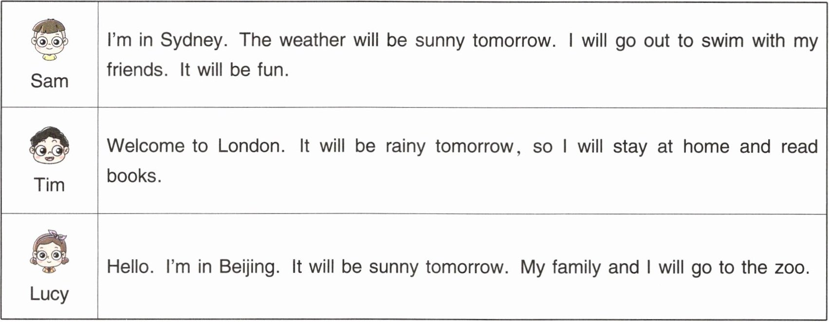 | Sam | I'm in Sydney. The weather will be sunny tomorrow. I will go out to swim with my friends. It will be fun. |