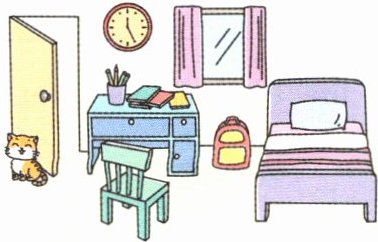 Look! This is my 1. ______. It's not very big. But it's nice. There is a clock 2. ______ the window. It's orange. How 3. ______ chairs are there? There 4. ______ only one. I have a cat. Her name is Mimi. Where is she? Oh, she is 5. ______ the door.
