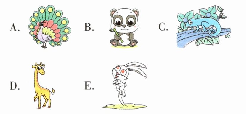 ( )4. It is orange. It has brown spots (斑点). It has small ears and a long neck (脖子).