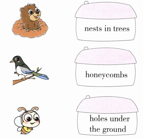 任务一:本题需要根据短文内容将动物和对应的住处匹配起来。短文中提到“Some animals live in holes under the ground. The woodchuck lives under the ground.” ,可知土拨鼠住在地下洞穴,图片中是土拨鼠的对应 “holes under the ground”;“Some birds live in nests in trees.” ,可知一些鸟住在树上的巢穴,图片中是鸟的对应 “nests in trees”;“Bees work hard to make their honeycombs.” ,可知蜜蜂建造蜂巢,图片中是蜜蜂的对应 “honeycombs”。