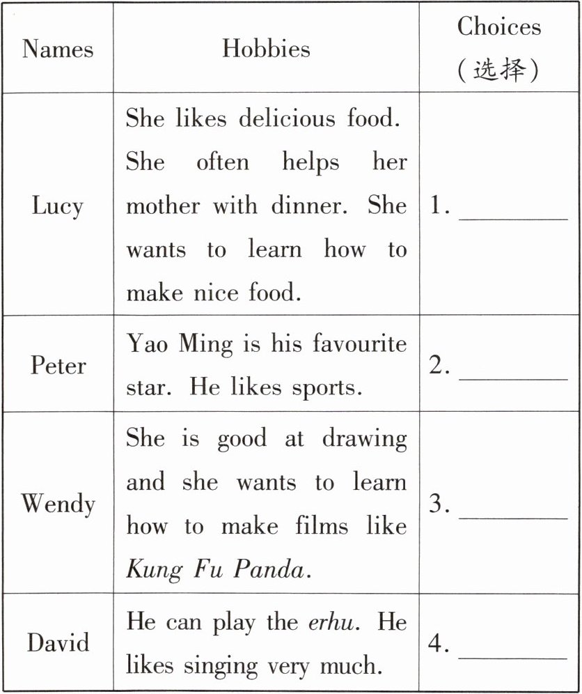 | David | He can play the erhu. He likes singing very much. | 4. ______ |