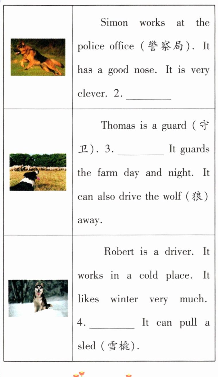 ||Robert is a driver. It works in a cold place. It likes winter very much. 4. ______ It can pull a sled (雪橇).|