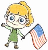 3. 第三幅图是一个女孩拿着美国国旗,问题是询问居住地点,“哪里”用“where”,主语是“she”,一般现在时中动词用“lives”,回答是“她住在美国”,“美国”是“the USA”。