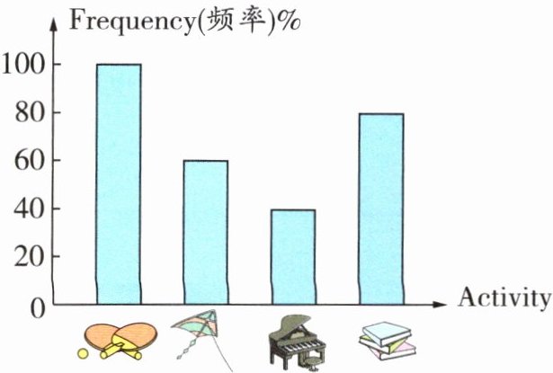 【解析】:本题可根据柱状图中各项活动的频率,结合英语中表示频率的词汇来补全句子。从柱状图可以看出,打乒乓球的频率接近100%,所以用“always(总是)”来描述;和家人一起做的活动频率较高,用“go on a picnic(去野餐)”且频率词用“often(经常)”;放风筝的活动频率相对较低,用“fly a kite(放风筝)”且频率词用“sometimes(有时)”;读书的活动频率较低,用“seldom(很少)”来描述。